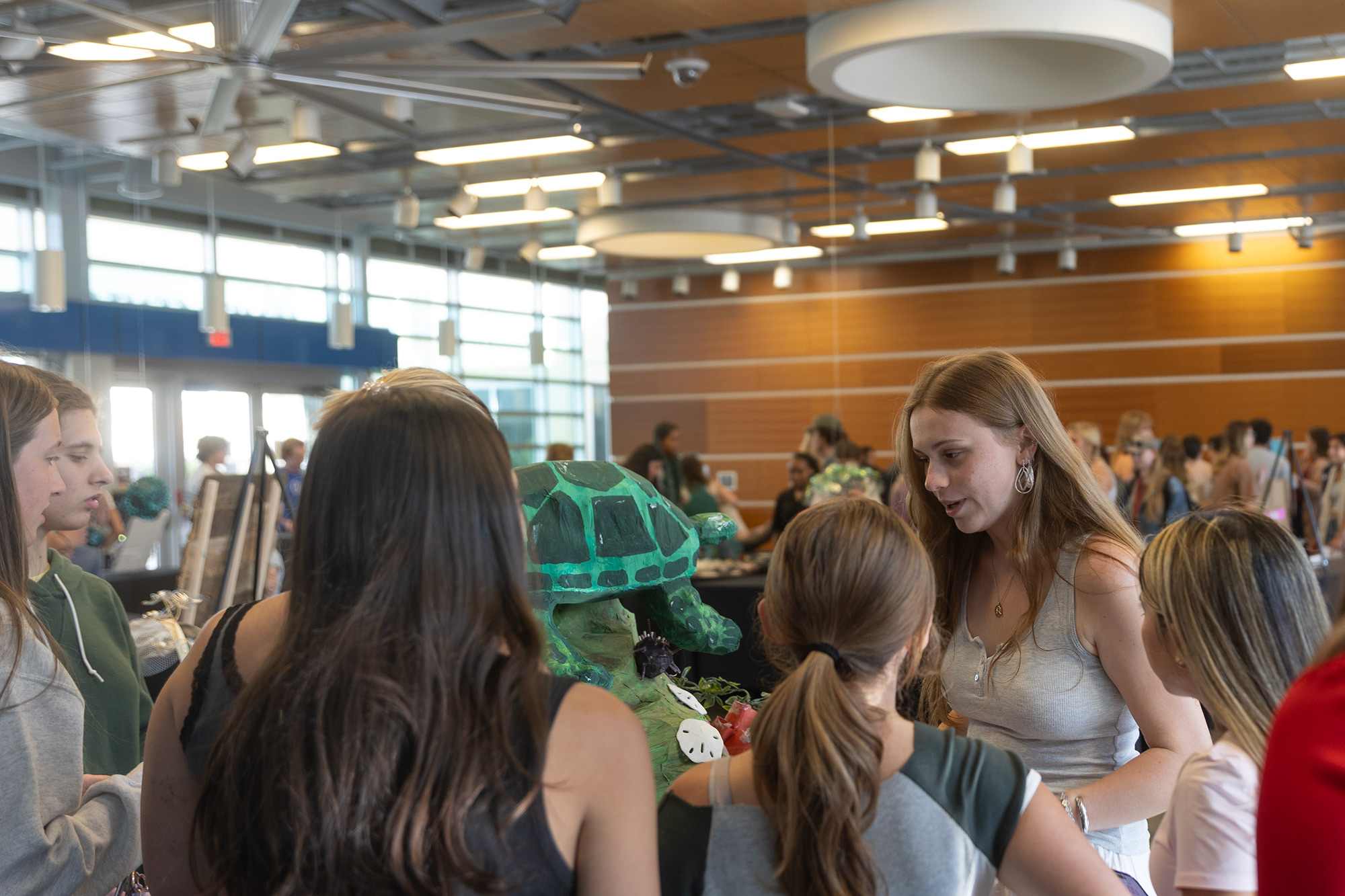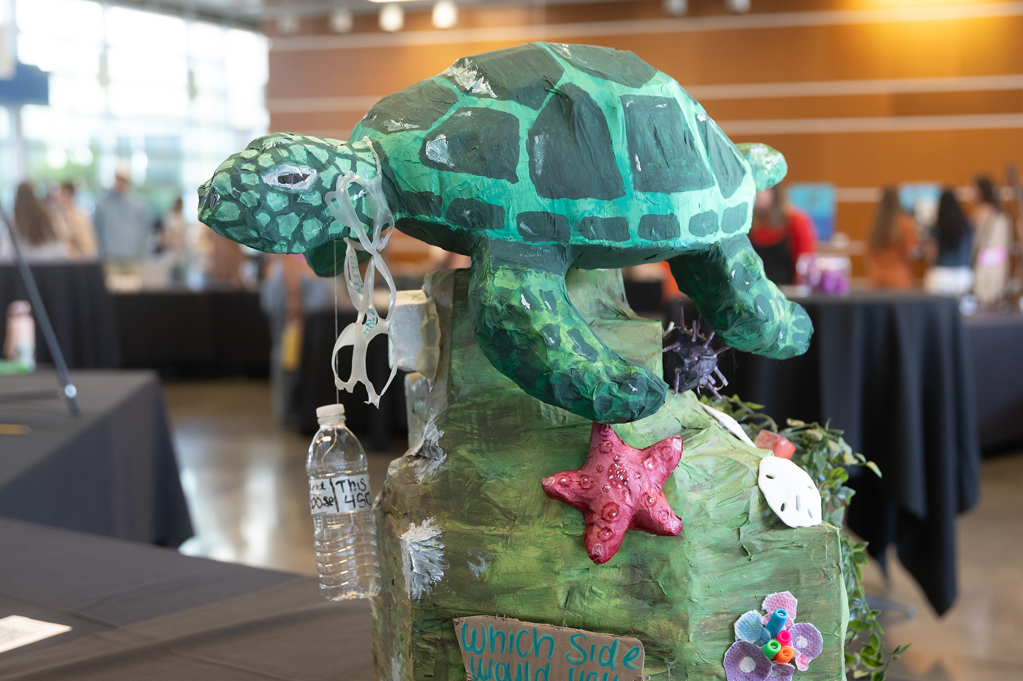 Sea creatures and environmental issues sprang to life through art created out of single-use plastic by Eckerd College students, Clearwater High School students and other community members on display April 9 in the Wrenn Hall lobby of the James Center for Molecular and Life Sciences at the Used Once, Lasts Forever Art Show.