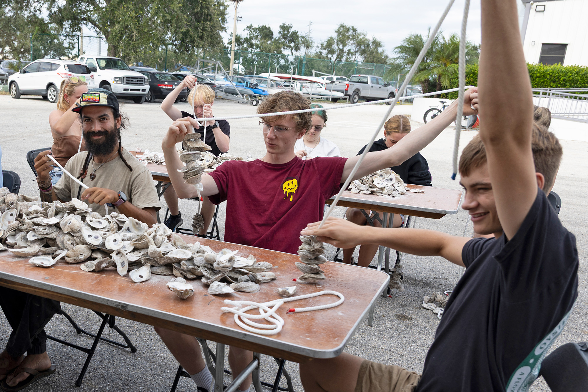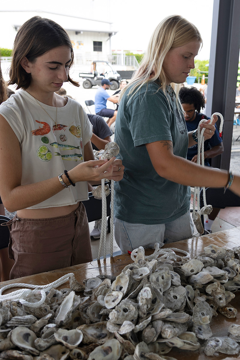 Nearly 80 students, faculty and staff came to the Waterfront for a vertical oyster garden building event co-sponsored by Tampa Bay Watch, the Gulf Scholars Program and the Office of Advancement. Attendees were asked to thread oyster shells onto knotted rope and hang the assemblages from docks across campus. The gardens attract small oysters to nest in communities—a manmade habitat—and act as natural filters for the waterways.