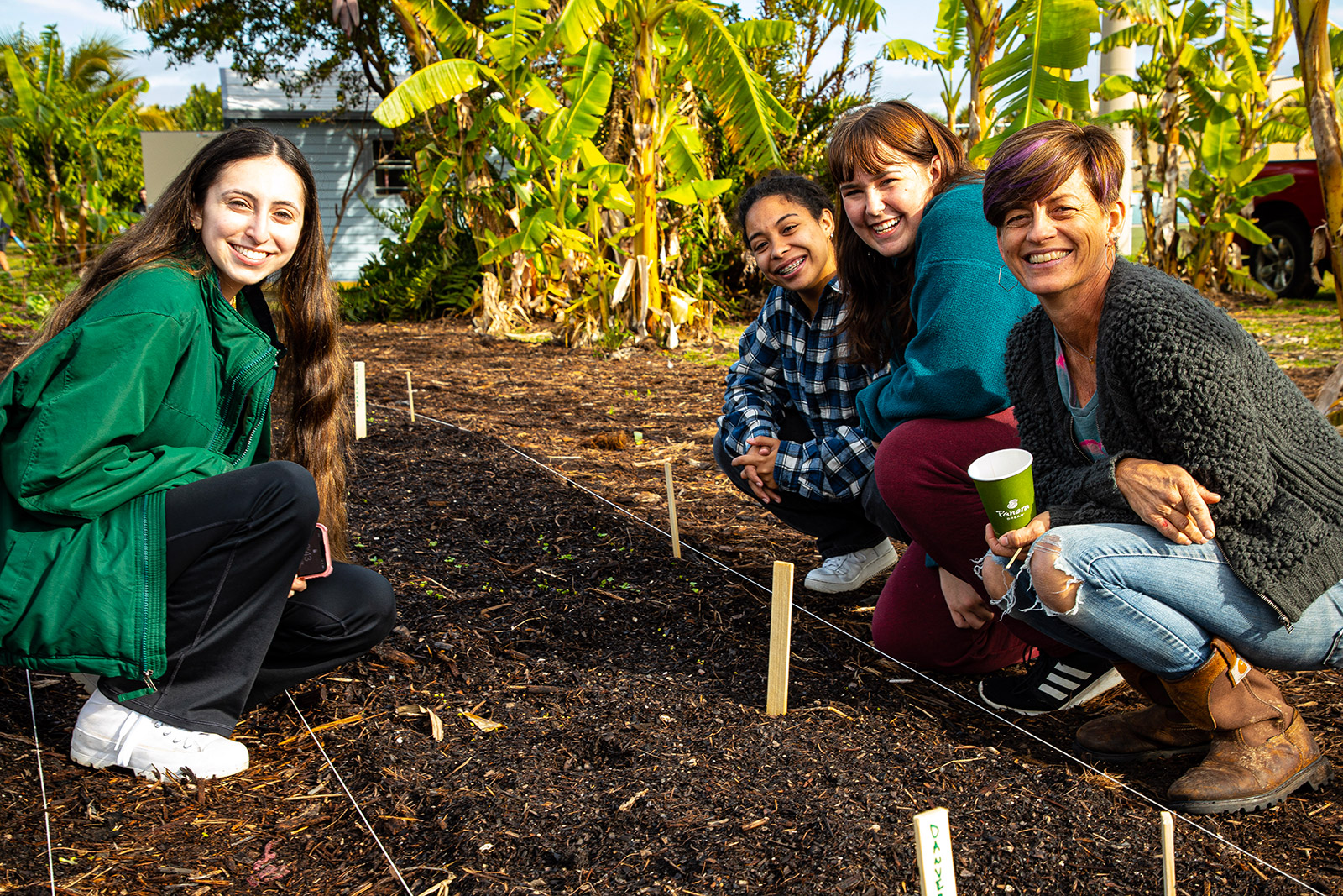 Left to right: Rubrum-Schaffhauser ’23, Karina Pomales ’24 and Zoe Smith ’24, students in the Gardening for Sustainability class, join Robin Clemmons, garden manager for DayStar Life Center, to plant seeds donated to the farm by the nonprofit organization. Photo: David Himmelfarb