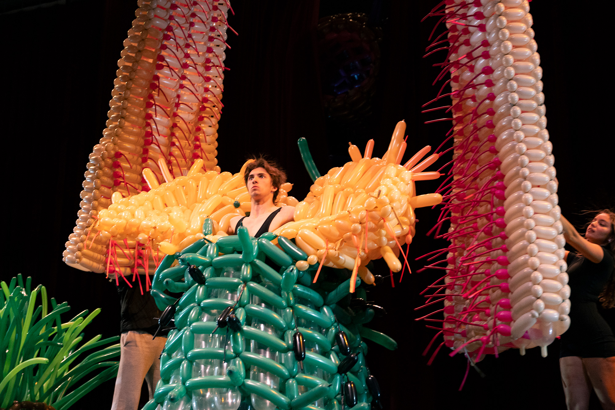 Wearing yellow-and-pink balloon wings, Sean Porter, a first-year musical theatre student from Stuart, Florida, was cast as Flapperhead—an unfeeling, egocentric character.
