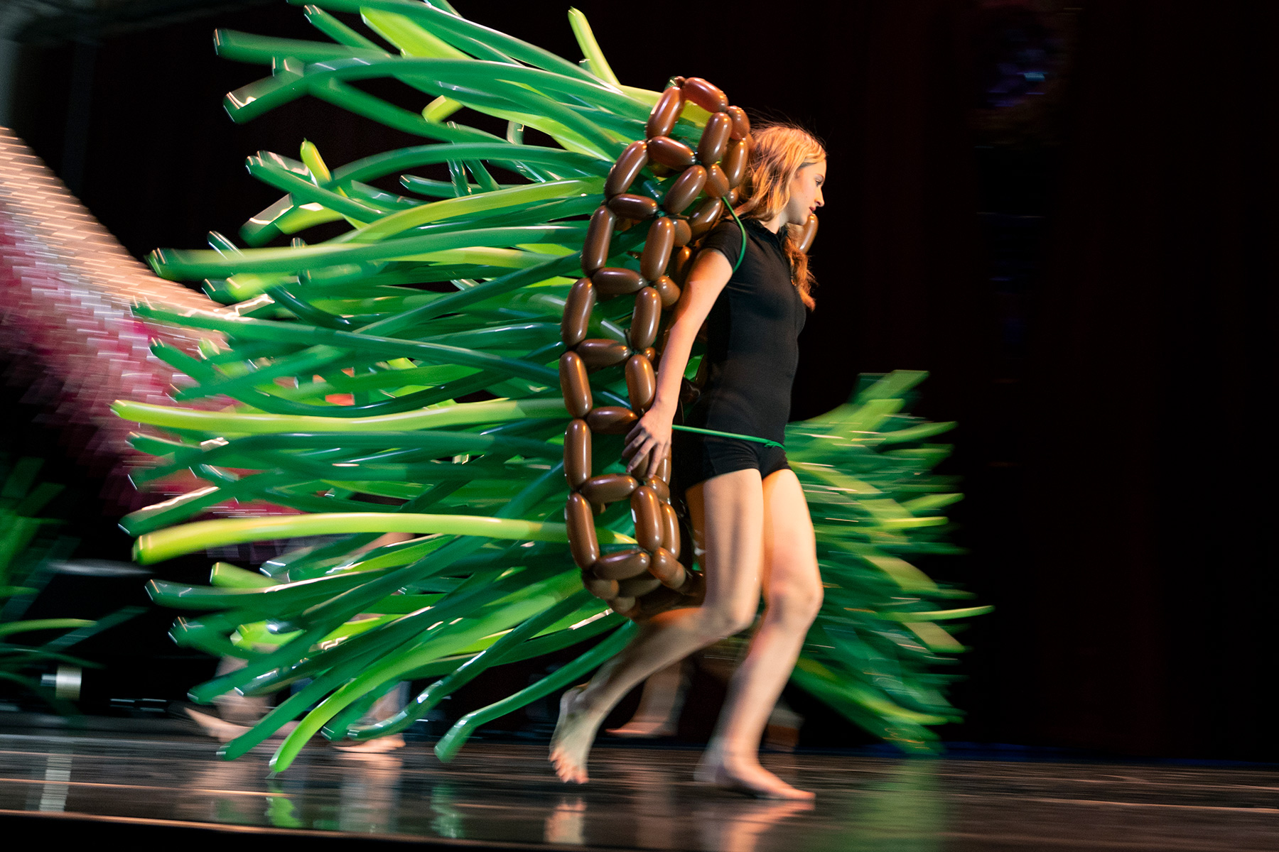 Students like Mac Ryan, a junior animal studies and theatre student from Valley Cottage, New York, who began acting classes at age 6. She came to the audition thinking the opera involved stiff, traditional sculptures. It was everything but that. For part of the performance, Mac wore a sizable collection of long, thin, green balloons attached to her back to portray moving grass. “There’s no dialogue, and I thought the audience might be confused,” she says. “But then I heard people bursting out in laughter and having a great time. Doing this was like a breath of fresh air.”