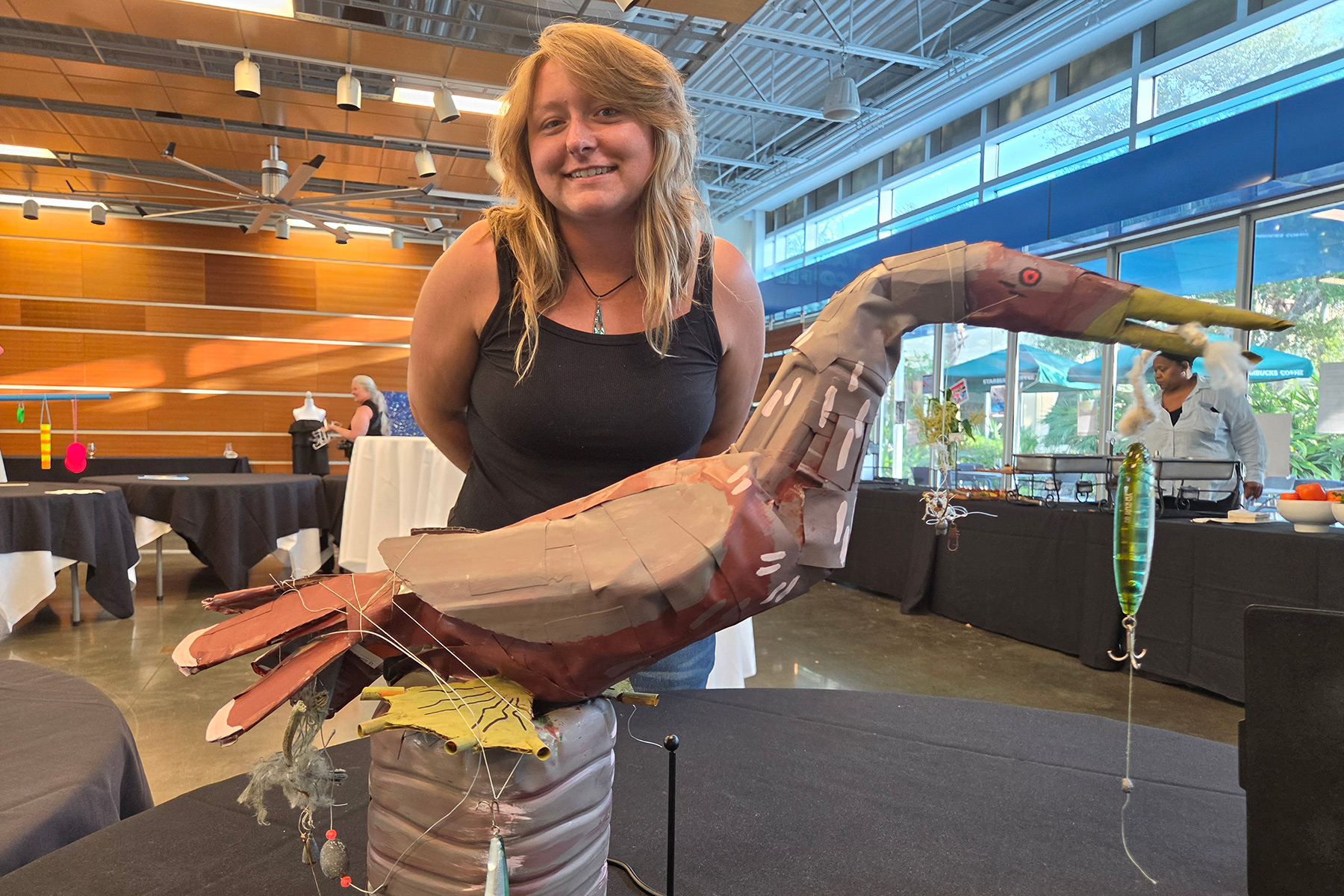 Olivia Kneebone, an Eckerd junior environmental studies student from Newport, South Carolina, managed to sculpt a bird out of plastic found around her dorm and then placed a piece of fishing line recovered while volunteering at a bird rescue in the statue’s beak. She was awarded “Best Environmental Message” for her piece titled “Intertwined.”