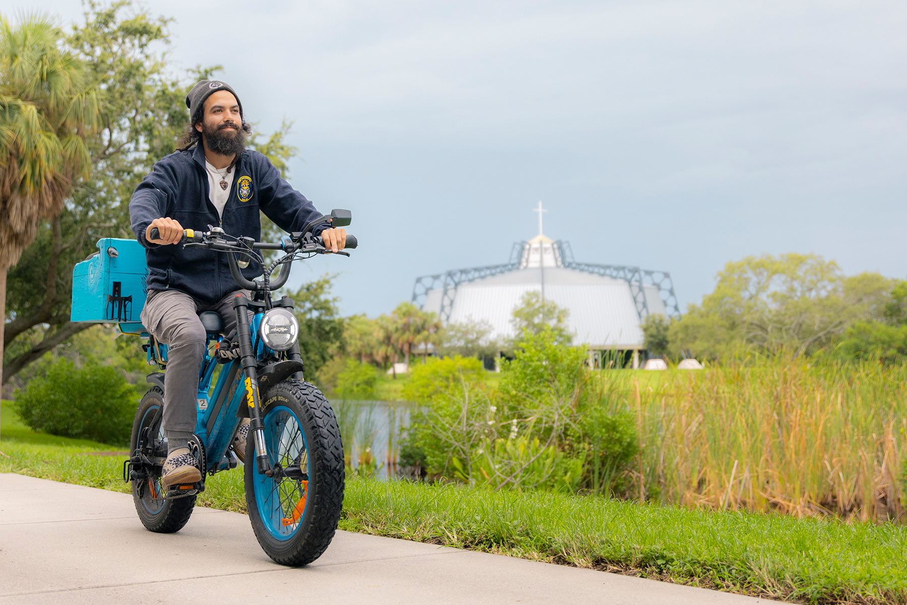 John David commutes to campus from Gulfport on his e-bike. Photo by Penh Alicandro ’22