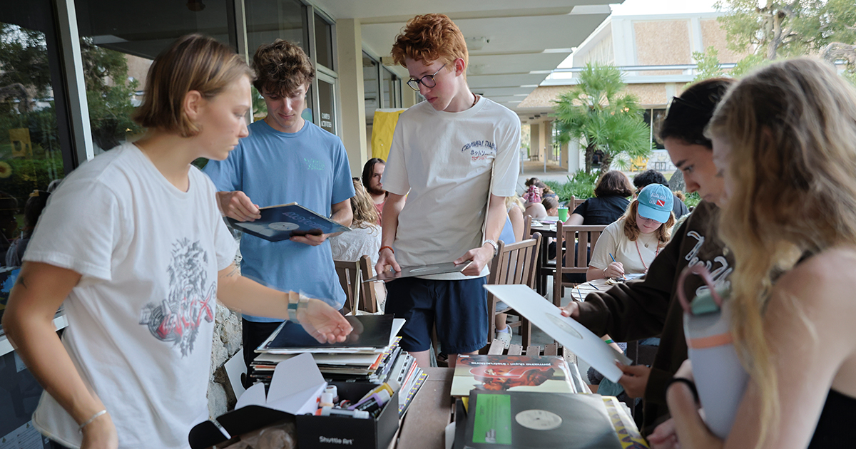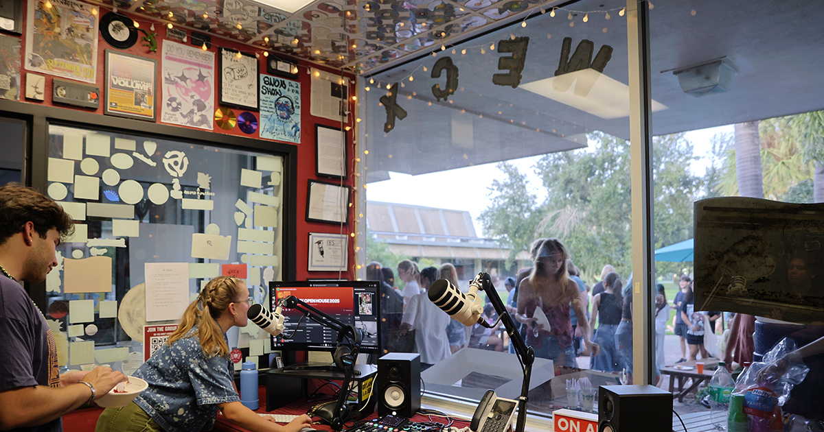 On any weeknight stroll past Eckerd College’s Brown Hall, you might catch amplified sounds from a small studio playing punk anthems, indie tracks or even a nighttime talk show. That’s WECX 99.9 Eckerd’s oldest and largest club, where students take the mic each week to share their playlists and voices.